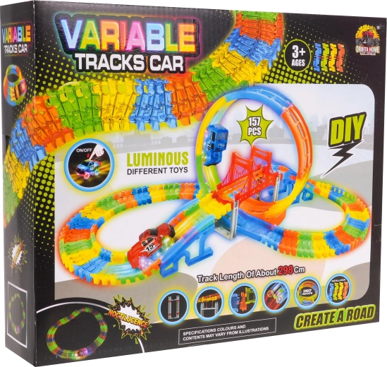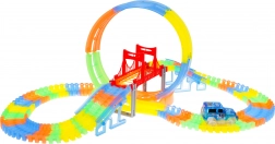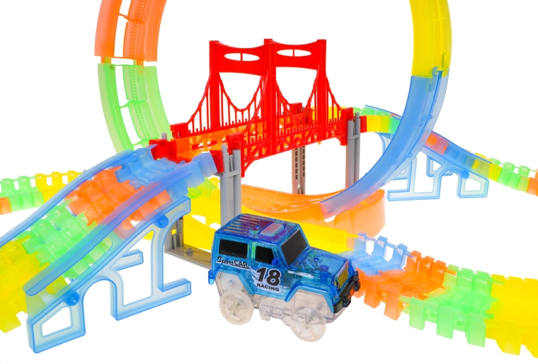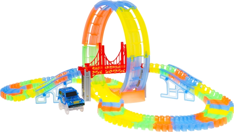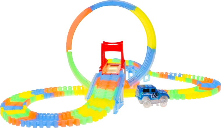 Circuit lumineux dans le noir avec looping et petite voiture inclus dans l’emballage, convient aux enfants dès 3 ans. Les pistes sont flexibles, on peut les agencer dans n’importe quelle combinaison, les tourner, les surélever, les réorganiser, et ce pendant que la voiture roule. Les pistes sont en outre fluorescentes et brillent dans l’obscurité. Le véhicule inclus possède un éclairage LED, offrant un effet spectaculaire lors de la conduite dans le noir. Le véhicule est alimenté par 2 piles AA 1,5 V (non fournies). Pour démarrer la voiture, il suffit d’appuyer sur le bouton situé sur son toit. Que la course commence ! |