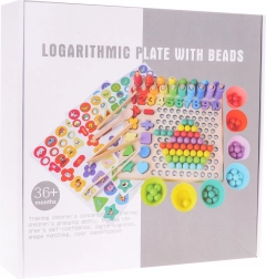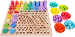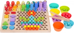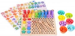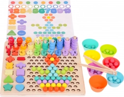 - base et plateau en bois avec ouvertures, 3 modèles recto-verso, 7 gobelets, pince, canne à pêche, cuillère, 2 baguettes, 8 poissons magnétiques, 5 signes mathématiques, chiffres 1–10, 5 formes (carré, triangle, cercle, étoile, cœur), 55 anneaux, 77 perles