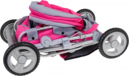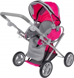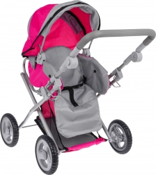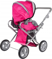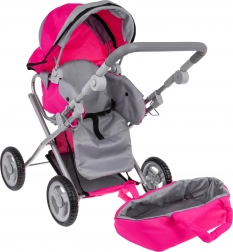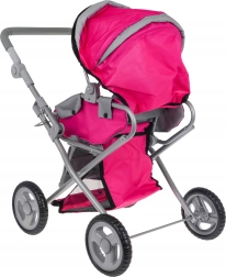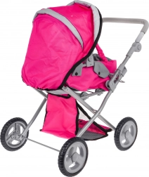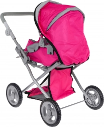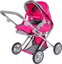 Élégante poussette rose pour poupées 2 en 1 pour enfants dès 3 ans. Elle propose une nacelle amovible et un siège sport, une poignée réglable 30–54 cm, un harnais de sécurité, un siège réglable et une capote pliante. Grâce à sa structure métallique légère et à la possibilité de pliage rapide pour le transport, elle convient à la maison comme en voyage ; sans oublier le panier en filet pour les accessoires.