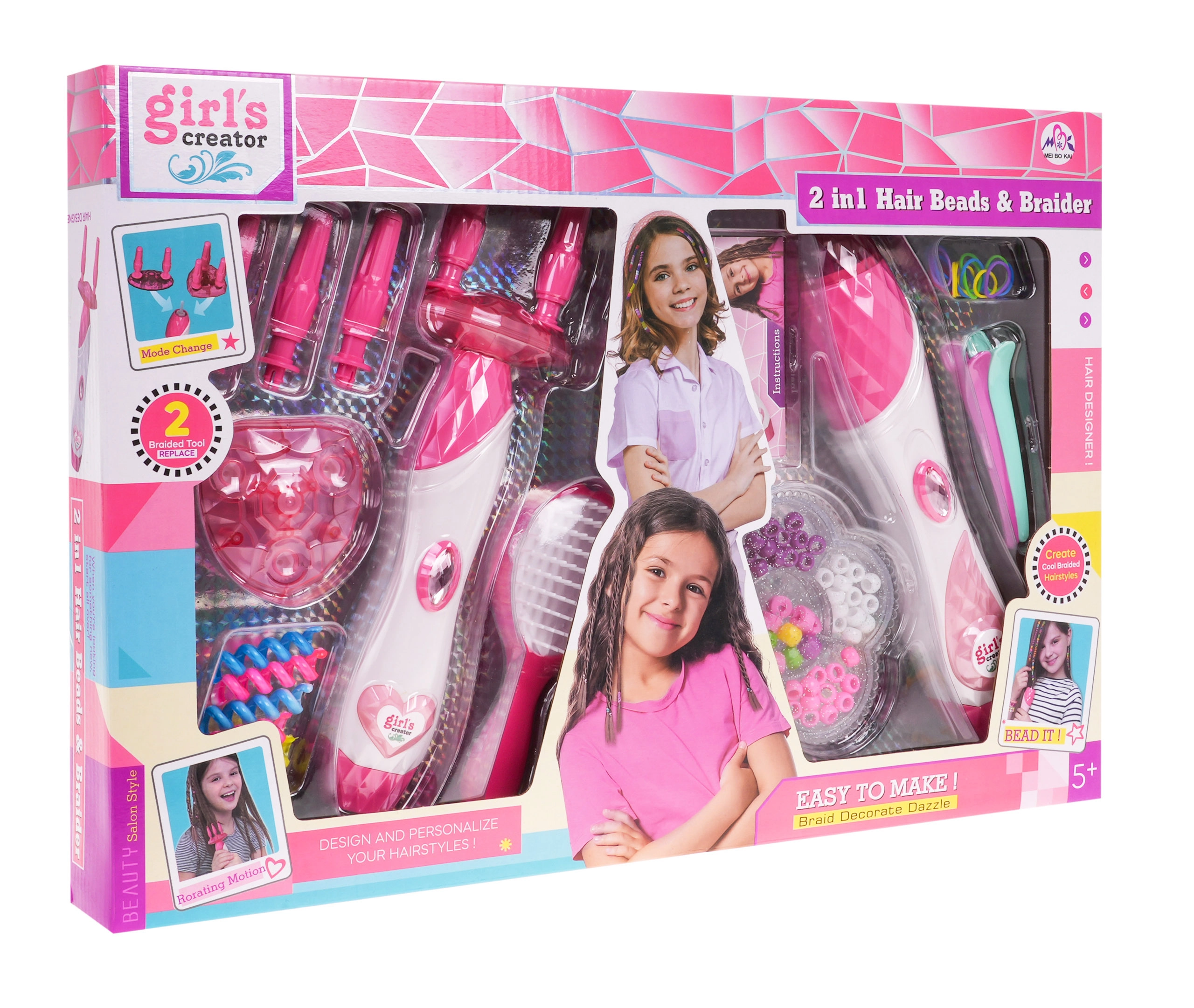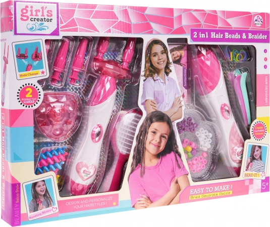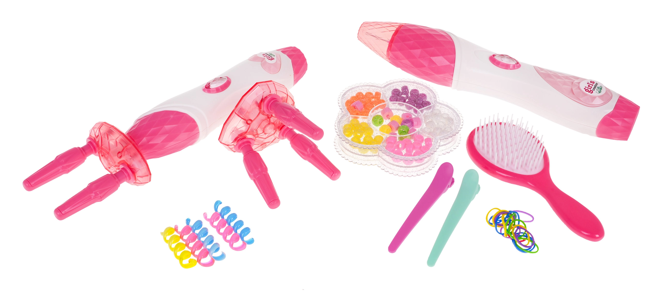 - appareil à tresser env. 26,5 cm x 7,5 cm x 7,5 cm, .- applicateur de perles pour cheveux env. 26 cm x 5,5 cm x 5 cm, .- boîte à perles env. 11 cm x 11 cm x 2 cm, .- perles env. 0,5 cm x 0,8 cm, .- brosse à cheveux env. 14,5 cm x 6 cm x 2,5 cm, .- ressort pour cheveux env. 4,5 cm x 1 cm, .- élastique pour cheveux env. 9,5 cm x 1,3 cm x 2 cm, .- emballage env. 44,5 cm x 30,8 cm x 5 cm, . |