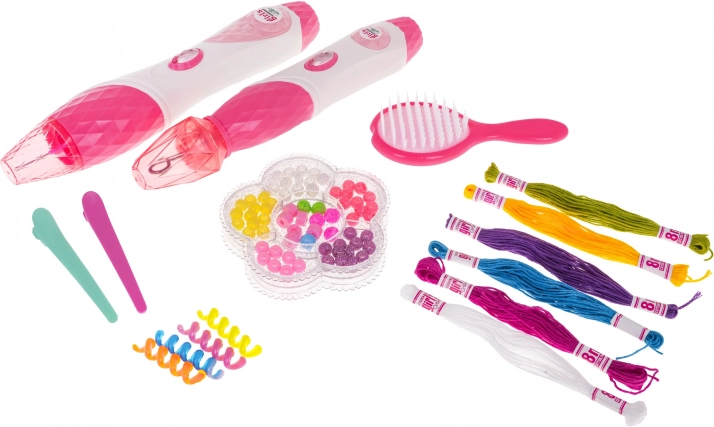 L’équipement complet comprend 2 outils de coiffage, 65 perles colorées, 6 fils moulinés (8 m chacun), une brosse, des pinces, des ressorts et une boîte à perles – tout-en-un pour des coiffures joyeuses au quotidien.
