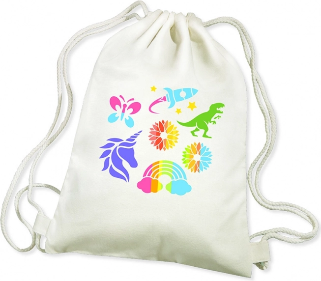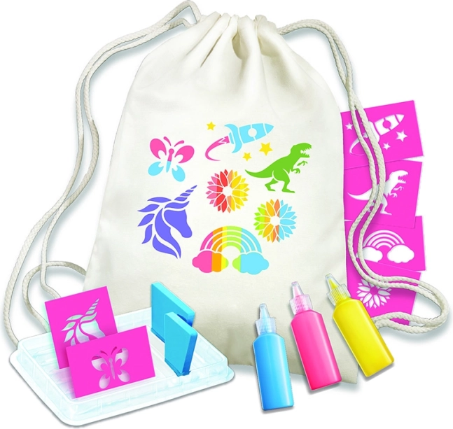 Sac à dos à cordon (27,5 × 36 cm), 3 flacons de peinture textile, 6 pochoirs autocollants, set de racloirs, support d’impression, notice détaillée