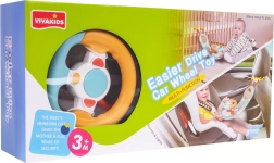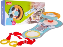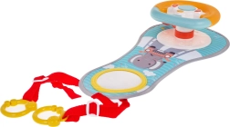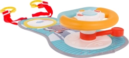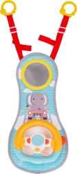 Les dimensions de l'ensemble sont d'environ 43 cm x 21 cm x 10 cm et il est facile à fixer sur l'appui-tête du siège. Le jouet est conçu uniquement pour les enfants assis face à la route et non pour les nourrissons orientés dans le sens inverse de la marche. La stimulation des sens de l'enfant se fait par le son et la lumière.