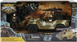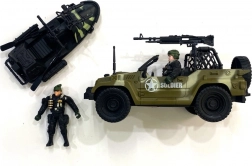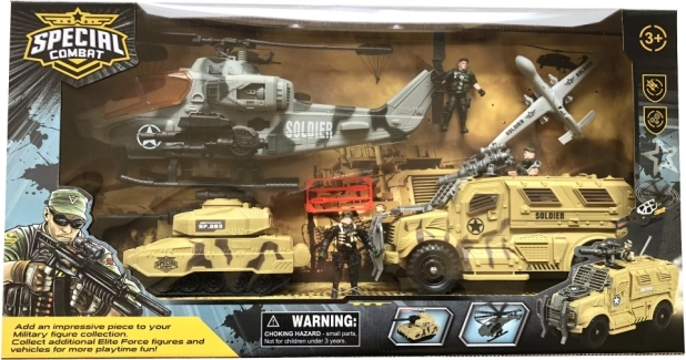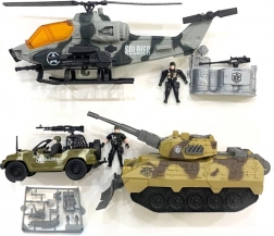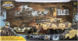 L'ensemble comprend divers véhicules militaires, y compris une voiture tout-terrain et un tank, idéals pour les missions de reconnaissance.