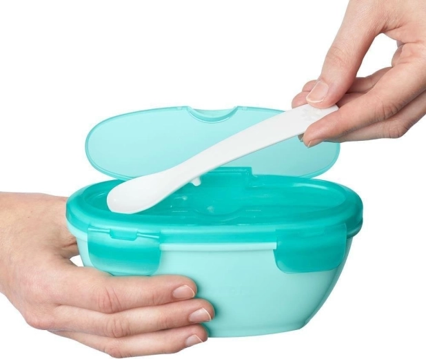 Une cuillère spécialement conçue qui s’insère dans le couvercle pour un repas confortable.