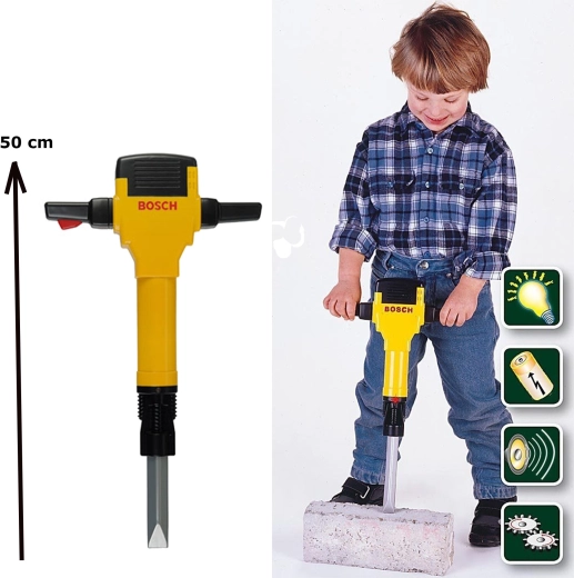 Le jouet propose des sons authentiques de fonctionnement du marteau et d’impacts sur le béton activés par contact de la pointe avec le sol, un témoin d’allumage (LED), un embout extensible et deux poignées confortables. Sa légèreté et sa robustesse assurent un divertissement sûr et durable.