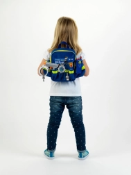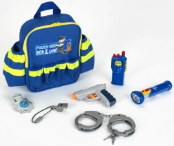 - Sac à dos, lampe de poche, talkie-walkie (jouet), sifflet, badge de police, menottes (jouet), pistolet à eau