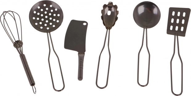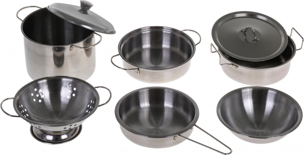 Comprend divers ustensiles de cuisine, y compris des casseroles, poêles et bols en acier inoxydable pour un jeu réaliste.
