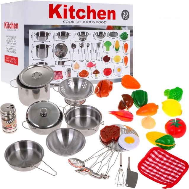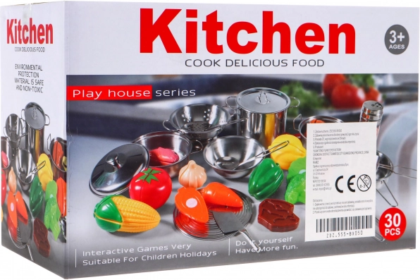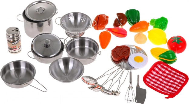 Découvrez le set de cuisine pour enfants qui comprend divers ustensiles en acier inoxydable et des imitations alimentaires en plastique. Idéal pour simuler la cuisine réelle et aider les enfants à développer leur créativité et leurs rôles. Cet ensemble est un excellent complément aux jeux de commerce, cuisine ou maison préférés.