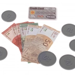 Le set contient différents types de monnaie pour enfant, une carte de crédit, et une gamme variée de marchandises, ajoutant une dimension réaliste au jeu de magasin.
