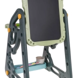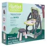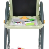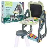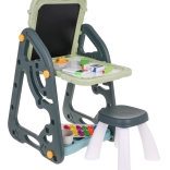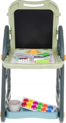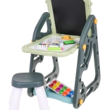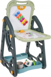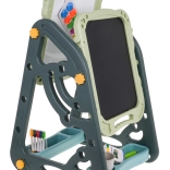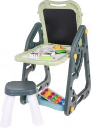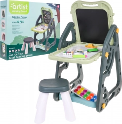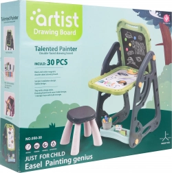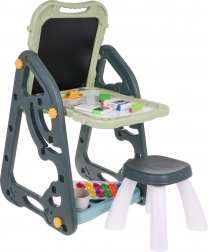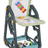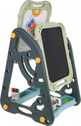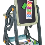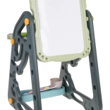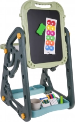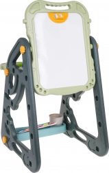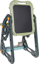 Ce grand ensemble multifonction se compose de deux tableaux : ardoise et magnétique, avec un tabouret confortable, c'est un choix idéal pour les enfants à partir de 3 ans. Il permet de régler le tableau en deux positions – d'un côté magnétique, de l'autre ardoise, ou comme table avec une surface pour dessiner. Sur la face blanche, on peut écrire au feutre ou fixer des aimants colorés, tandis que la face noire est destinée au dessin à la craie. L'ensemble comprend également deux étagères pour accessoires artistiques.