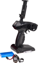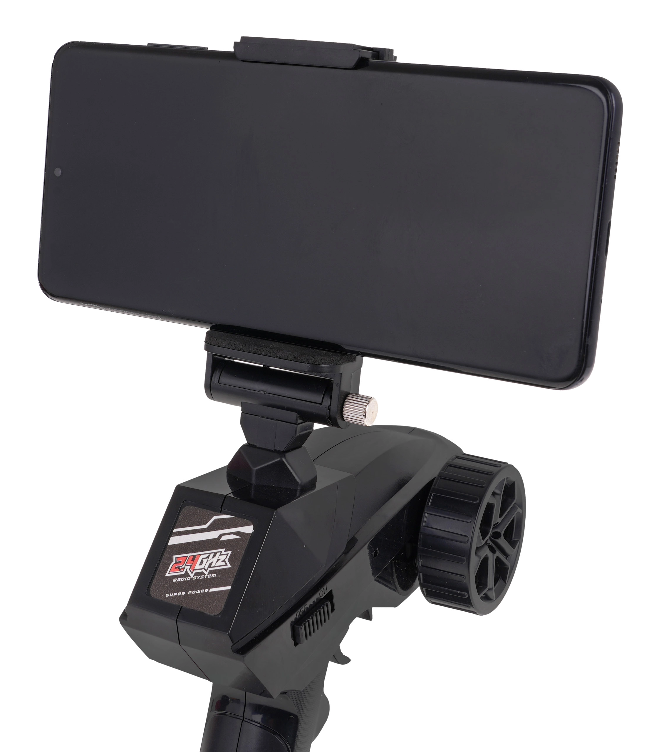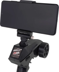 Radiocommande pistolet ergonomique avec direction précise et trim, fonctionnant en 2,4 GHz sans interférences. Le support de téléphone intégré facilite le suivi de l’image de la caméra.