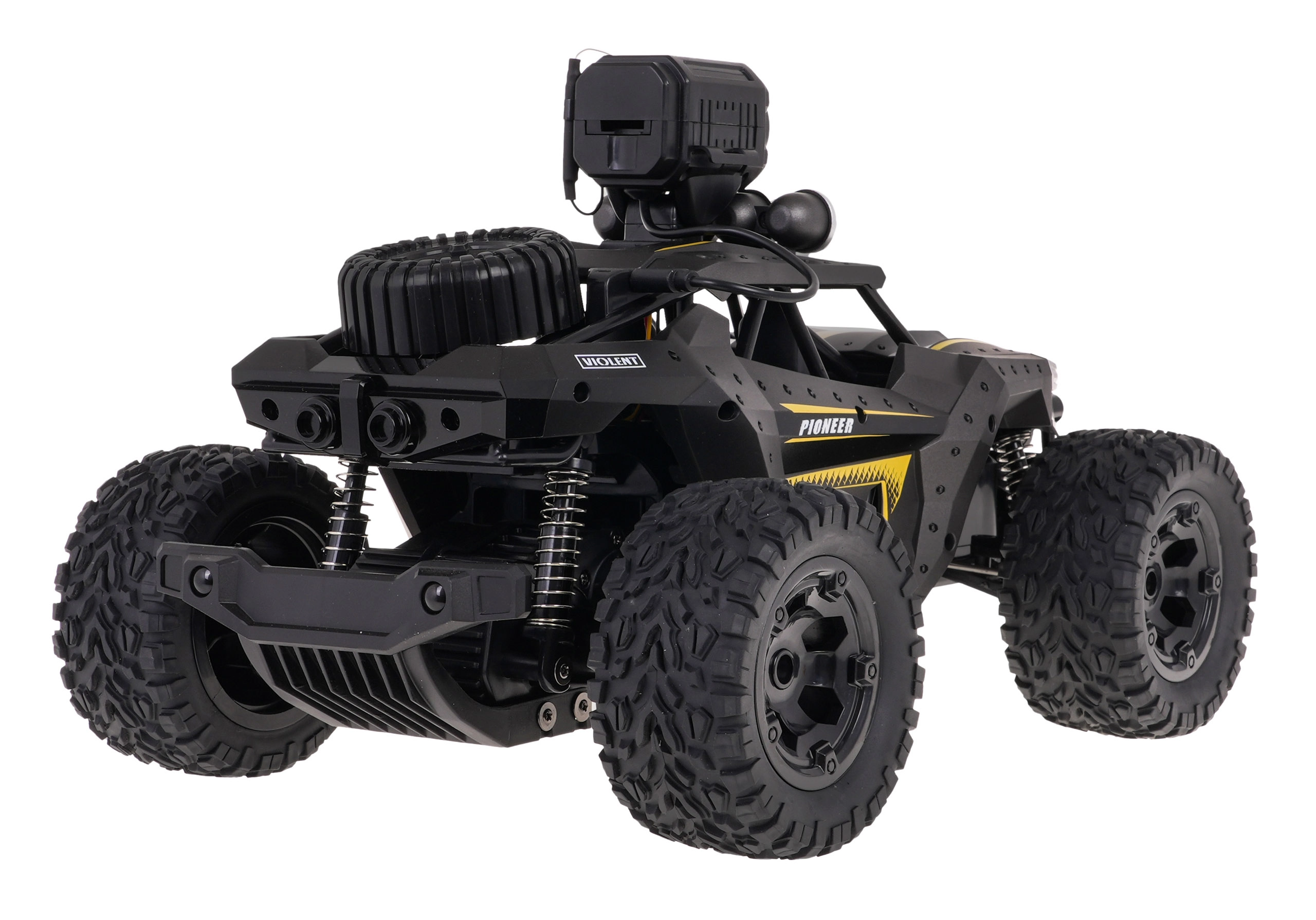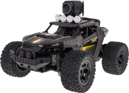Le véhicule RC tout-terrain PIONEER avec caméra est conçu pour l’aventure. Grande garde au sol, gros pneus en caoutchouc à profil agressif et amortisseurs efficaces assurent une excellente traction et stabilité sur gravier, herbe ou terre. La carrosserie métallique et le cadre anti-collision protègent la voiture en cas de chocs et de chutes.