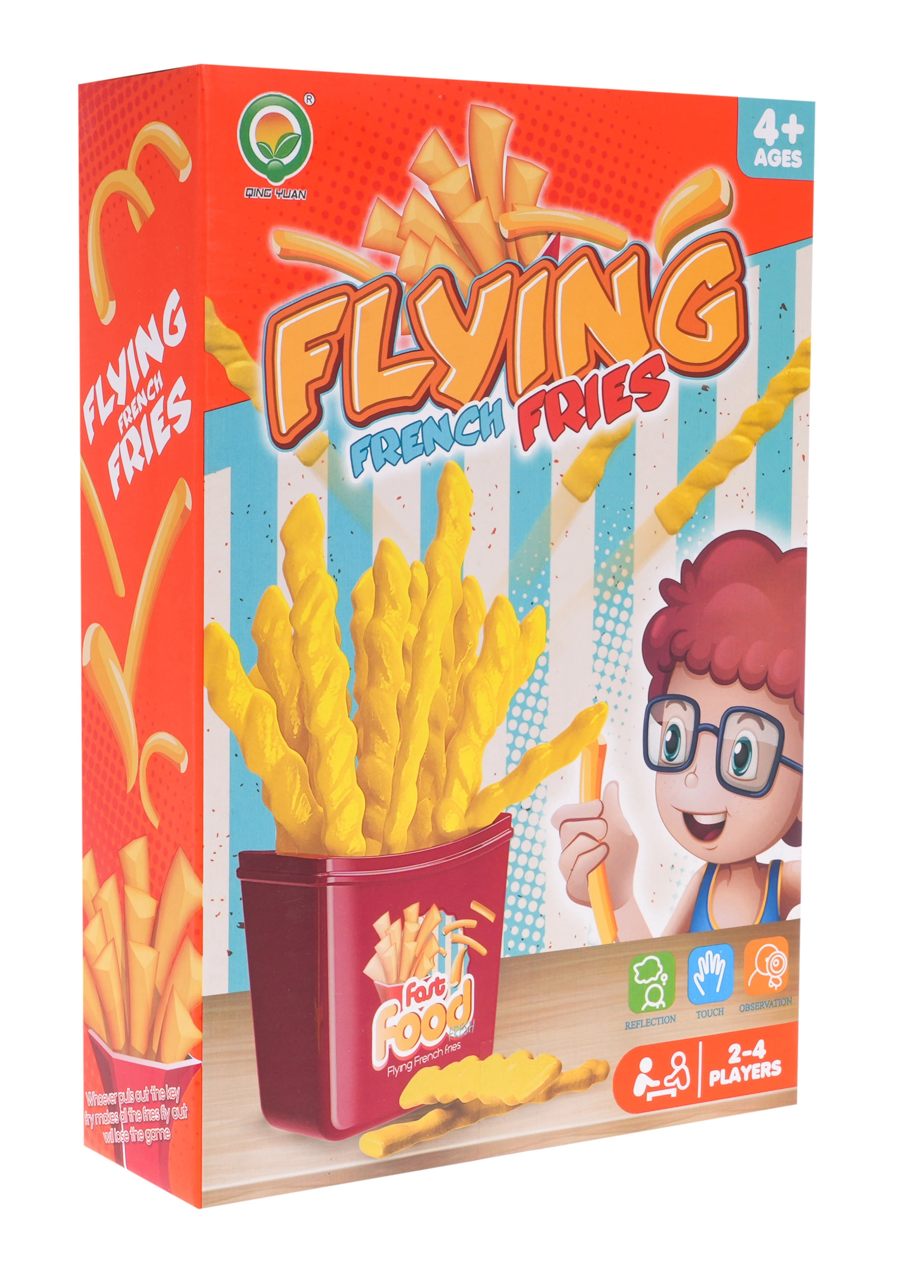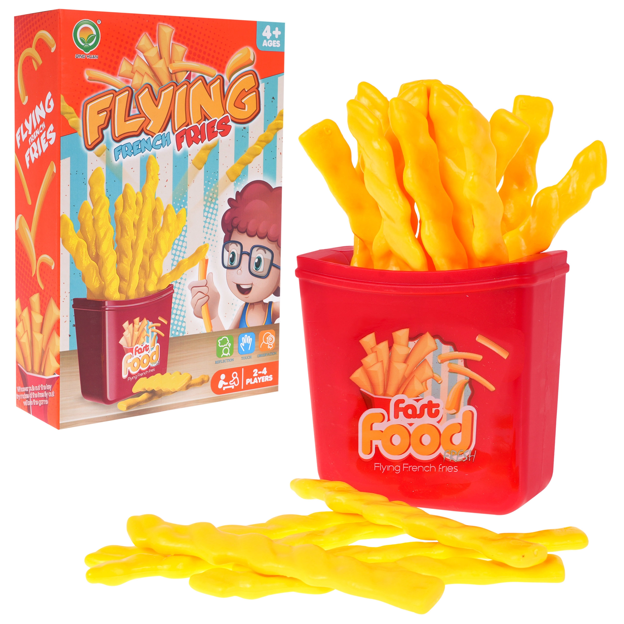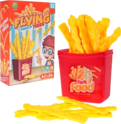 Jeu d’adresse Frites est un jeu amusant adapté aux enfants dès 4 ans ainsi qu’aux adultes. Il se joue de 2 à 4 joueurs en même temps. Le but du jeu est de tirer la frite correcte — si vous choisissez la mauvaise, toutes les frites jaillissent vers le haut !