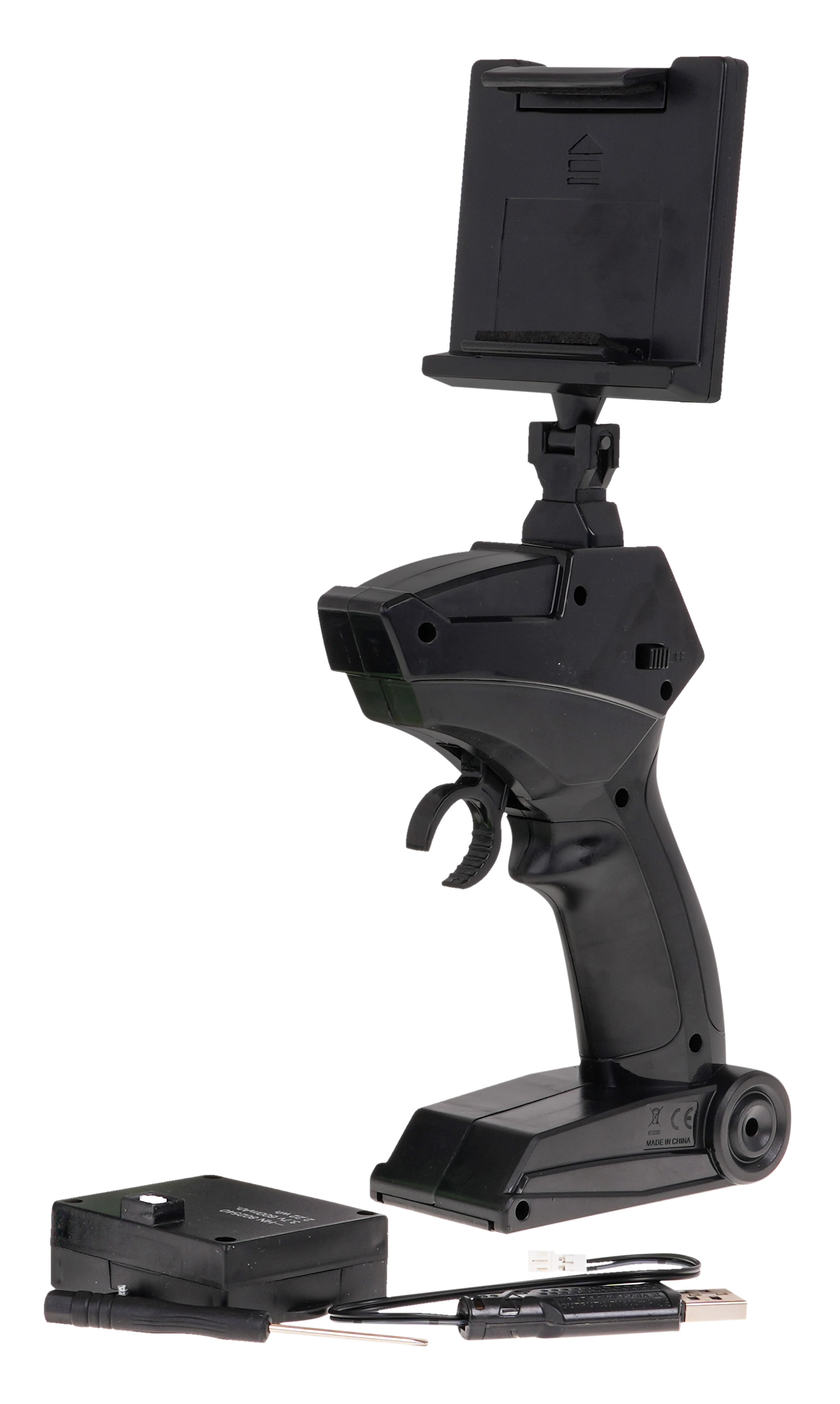 Radiocommande pistolet avec direction précise et support téléphone, offrant une portée stable sans interférences. Prend en charge marche avant/arrière, virages progressifs et correction fine de la trajectoire.
