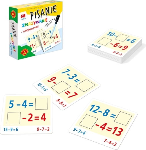 Le set d’écriture pour la soustraction est destiné aux enfants qui commencent à apprendre les mathématiques. Les cartes du set proposent 68 exercices de soustraction. L’inconnue peut être l’un des 3 nombres de l’exercice. Les opérations se font avec des nombres de 1 à 20. Les inconnues des exercices sont écrites avec un stylo effaçable, ce qui permet de réutiliser les cartes à l’infini. Ce jouet est un excellent support pour mémoriser les exercices de calcul et chercher les solutions de manière autonome, développant ainsi les capacités naturelles. Chaque résultat inscrit peut être vérifié grâce aux solutions indiquées au dos de la carte. Le format pratique de l’emballage permet d’emporter le jouet absolument partout.