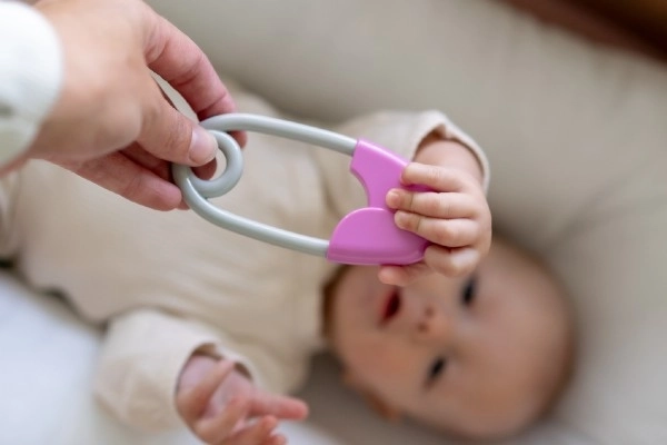 Les couleurs contrastées rose et gris stimulent la perception visuelle et attirent le regard des enfants.