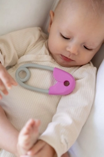 Le hochet en forme d’épingle est un élément indispensable de l’équipement de chaque enfant. Il est conçu pour être facilement saisissable par les petites mains et, grâce à sa légèreté, ne fatigue pas les bras des bébés. Ses couleurs contrastées rose et gris attirent l’attention et soutiennent la perception visuelle. Les enfants apprécieront le doux cliquetis produit à chaque mouvement.