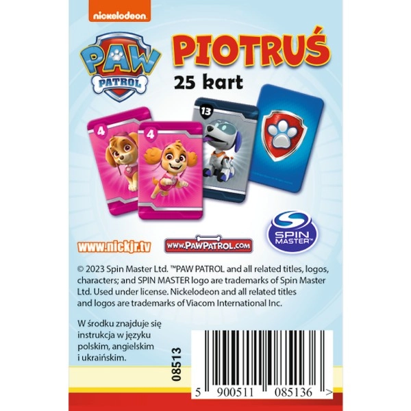 Jeu de cartes Piotruś sur le thème PAW PATROL de la marque Trefl, offrant une partie rapide et amusante pour les enfants dès 4 ans. Règles simples, personnages préférés et développement de l’attention et de la concentration en font un excellent choix pour les moments en famille et les voyages.