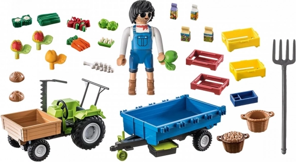 La figurine du fermier, la remorque, les cagettes, les fruits, les légumes et les outils élargissent les possibilités de jeu et développent la motricité fine.