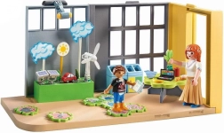 Le set comprend des poubelles de tri, des plantes, des décorations écologiques, des éléments d’infrastructure « verte » ainsi que du matériel scolaire. Compatible avec d’autres sets PLAYMOBIL (par ex. extensions de salles de classe), il s’intègre aisément dans un univers scolaire plus vaste.