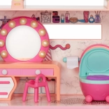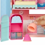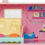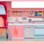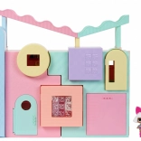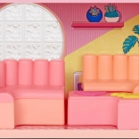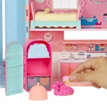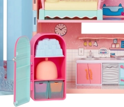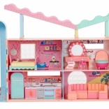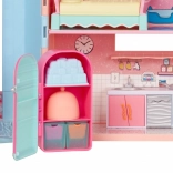 La maison est dans des tons pastel et comprend diverses pi38ces et accessoires pour un jeu parfait.