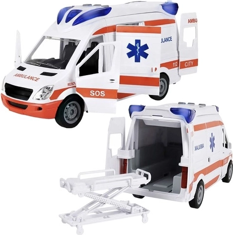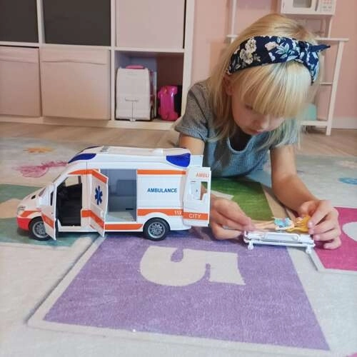 Cette ambulance en plastique reproduit fidèlement un véhicule de secours réel – de la décoration aux fonctions. Les enfants apprécieront les trois boutons sur le toit pour activer les lumières et les sirènes, tandis que les portes avant, latérales et arrière ouvrantes donnent accès à un intérieur détaillé. Inclus: brancard pliant et extensible pour “charger” facilement le patient dans le véhicule.