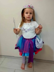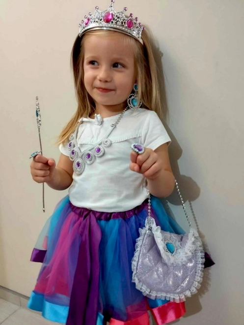 Ce set magique de 9 pièces transforme chaque enfant en véritable princesse en un instant. La jupe tutu multicolore dans des nuances de rose, violet et bleu se distingue par ses couches de tulle aériennes et sa taille confortable. L’élégante tiare avec pierres roses, le collier scintillant et les boucles d’oreilles soulignent l’allure festive, tandis que la baguette magique et le ravissant sac à main complètent la tenue.