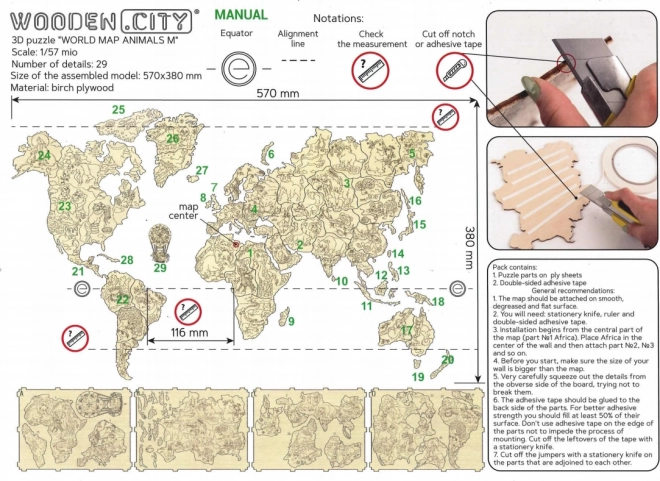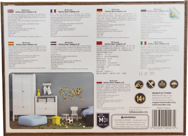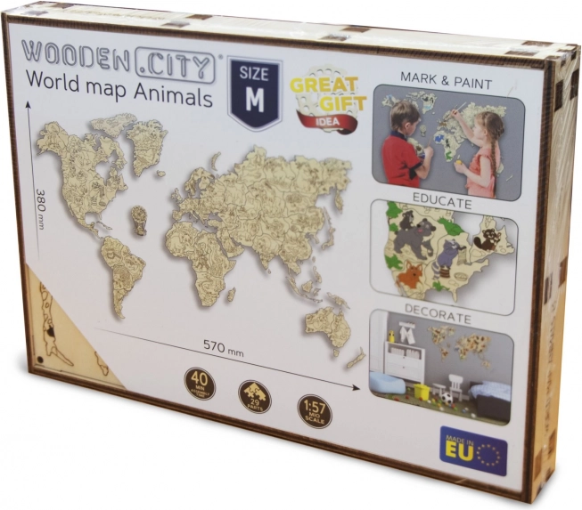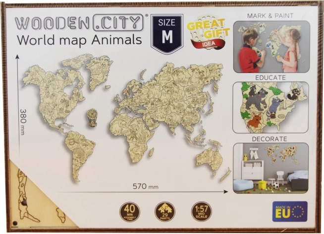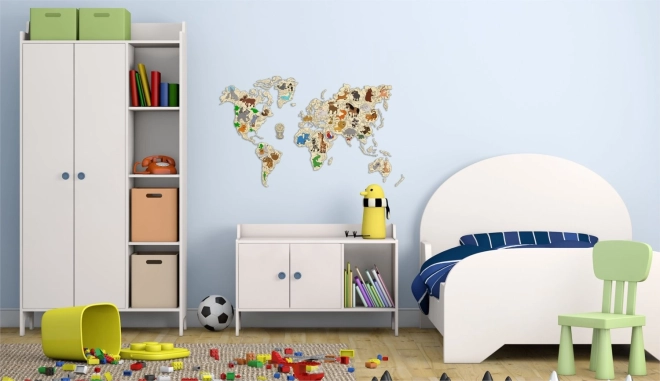 La carte du monde en bois avec animaux de WOODEN CITY est une belle décoration pour la chambre d’enfant qui stimule la créativité et l’intérêt pour la nature et la géographie. Grâce à une installation facile avec du ruban adhésif double face, vous la placez rapidement sur un mur, une porte ou une armoire. Elle est fabriquée en contreplaqué de bouleau de qualité et se prête parfaitement à la coloration.