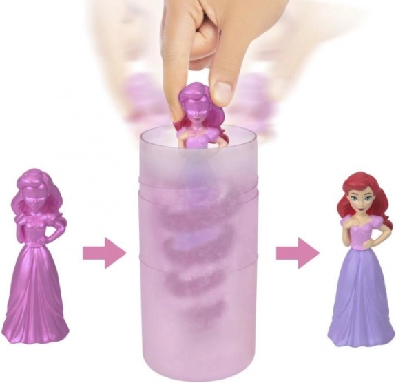 Commencez par ouvrir le tube : vous y trouverez une petite poupée mystère (env. 3,5"/9 cm) recouverte d’une couche Color Reveal et trois sachets d’accessoires. Remplissez le tube d’eau, plongez la poupée et faites-la tournoyer délicatement – son look caractéristique inspiré des films Disney se révélera en quelques instants.