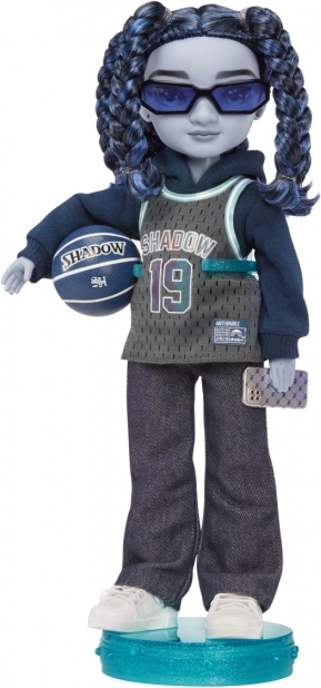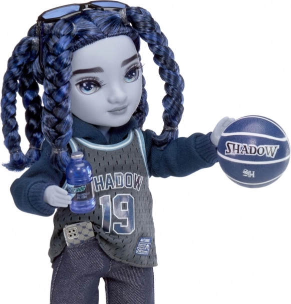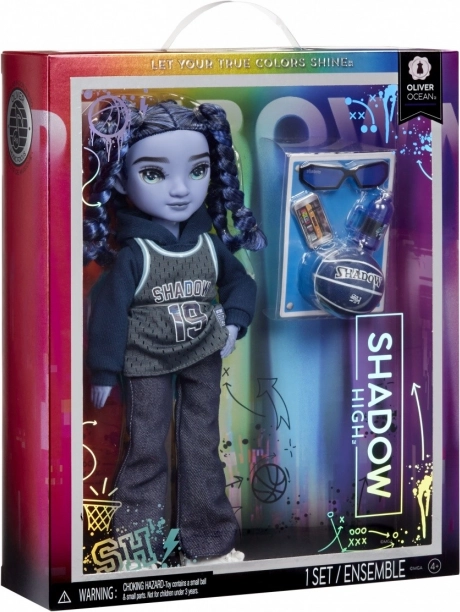 Cette poupée Shadow High avec une peau bleue et des cheveux tressés est vêtue d'une tenue sportive avec le numéro '19' et fait partie de la collection tendance 'Oliver Ocean'. Elle est le cadeau idéal pour les enfants à partir de 6 ans qui aiment les jeux créatifs et les personnages stylés.