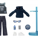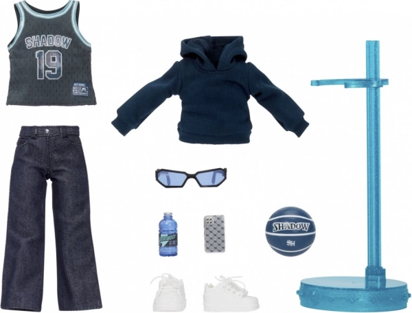 Comprend une large gamme d'accessoires de mode, qui incluent une chemise 'Shadow 19', un sweat à capuche, un jean, des baskets et un ballon de basket. Ces accessoires favorisent le jeu créatif et enrichissent les possibilités de stylisme.
