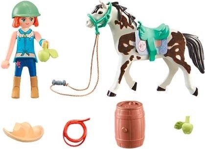 - Ce set au design adorable comprend la figurine PLAYMOBIL Ellie, le cheval Sawdust, une selle, une bride, un lasso et de nombreux autres accessoires pour l’équitation western et les soins du cheval.
