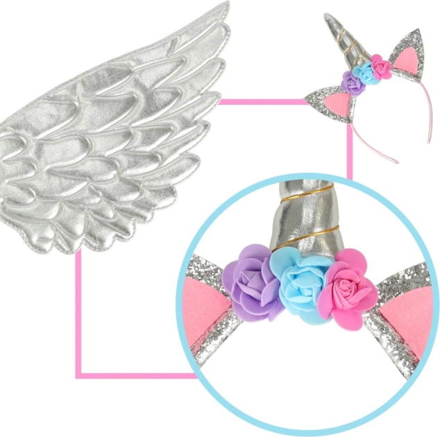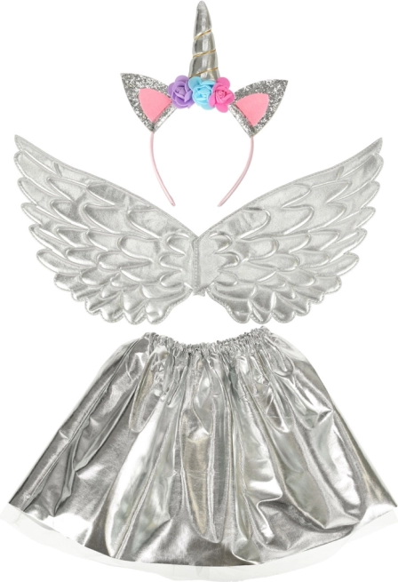 Ce superbe costume permet de transformer votre enfant en une licorne unique. Il se compose d’une jupe argentée, d’ailes élégantes et d’un serre-tête finement orné de petites roses. Idéal pour toutes les occasions où l’enfant peut s’amuser dans un univers féerique.