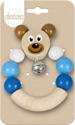 Hochet en bois avec petit ours de couleur bleue. Facile à saisir, la petite clochette tinte délicatement.