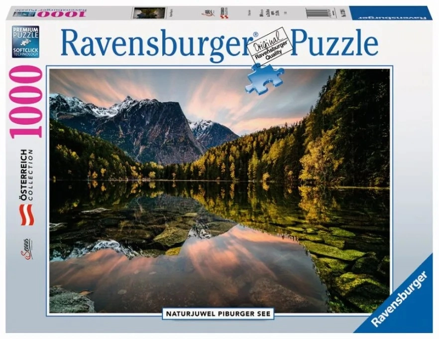 Découvrez le motif paisible du lac Piburger sur des puzzles Ravensburger de qualité avec 1000 pièces et des dimensions une fois assemblé de 70 × 50 cm. Grâce à la structure en lin antireflet du papier, au carton épais et à la technologie SoftClick, les pièces s’emboîtent avec précision et le puzzle est résistant et agréable au toucher. Convient à partir de 14 ans.