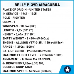 Le Bell P-39D Airacobra est un chasseur monomoteur américain de la Seconde Guerre mondiale, réputé pour sa vitesse maximale élevée et ses performances à basse altitude. Ce set de construction vous permet de remonter le temps et de créer votre propre modèle de cet appareil à l’échelle 1:32. Le modèle est richement détaillé et propose de nombreuses parties mobiles, telles qu’une hélice rotative, des volets mobiles et des roues avec pneus en caoutchouc. La verrière du cockpit peut s’ouvrir pour y placer la figurine du pilote historique.