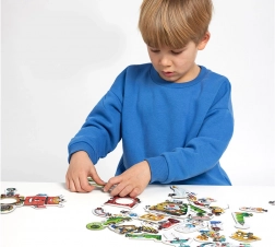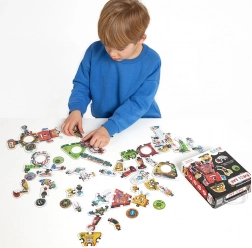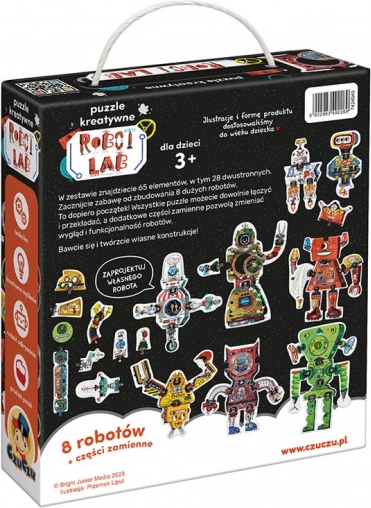 Le puzzle créatif Robot Lab offre des possibilités d’assemblage infinies. Il se compose de 63 pièces de haute qualité, brillantes et précisément découpées, qui s’accordent parfaitement grâce à leur design ingénieux et à leurs illustrations. Les enfants commencent par assembler 8 grands robots, puis, à l’aide de pièces « de remplacement », modifient leur apparence – ou créent des personnages et des machines entièrement nouveaux.