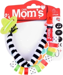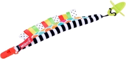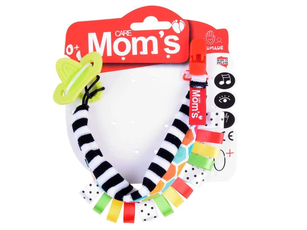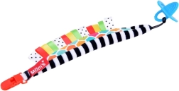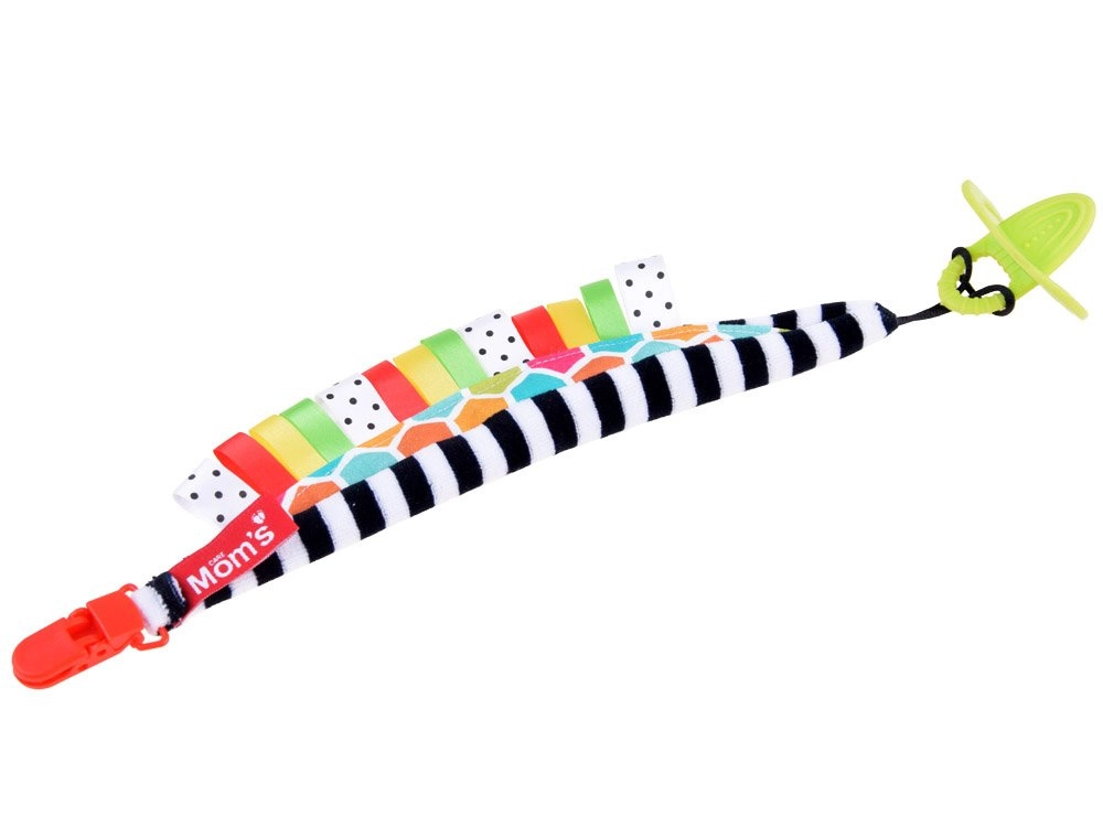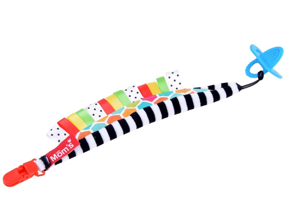 Une solution astucieuse pour les bébés dès la naissance : le clip pour tétine avec anneau de dentition combine une fixation sécurisée de la tétine et une stimulation sensorielle. Les rayures noir‑blanc soutiennent la bonne perception des contrastes chez les plus petits, tandis que les étiquettes colorées invitent à l’exploration et entraînent les doigts.
