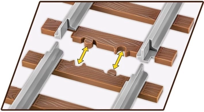 Le set comprend deux plaques interchangeables avec le nom de la locomotive au choix : l’allemande BR 52 et la polonaise Ty2. COBI a également produit sa propre brique reproduisant une section de voie. Cinq sections de ce type, pour une longueur totale d’environ 65 cm, sont incluses. Les rails sont fabriqués avec une technologie moderne de moulage bi‑injection, ce qui signifie que chaque section d’environ 13 cm, constituant un seul élément monolithique, est réalisée en deux plastiques de couleurs différentes solidarisés entre eux. Les rails gris couleur acier se détachent nettement sur les traverses brunes très réalistes. Aucun tenon (plot) n’est visible sur chaque traverse, ce qui accroît leur réalisme, et chacune est couverte d’une texture de planches imitant le bois. Les rails peuvent être clipsés sur des plaques de construction et comportent un trou technique, ce qui permet de les fixer solidement à un diorama ferroviaire, par exemple à l’aide d’une vis ou d’un petit clou.