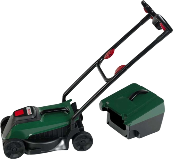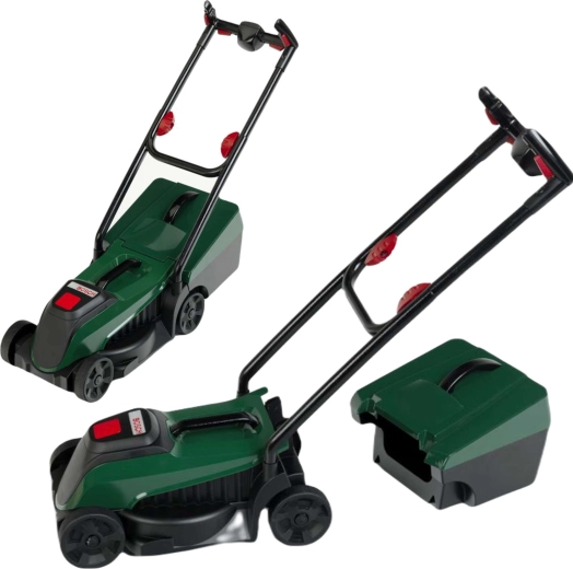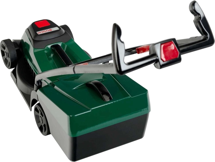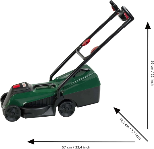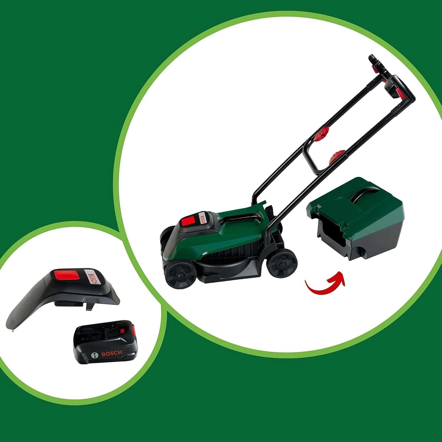 Tondeuse pour enfants réaliste de couleur vert foncé avec module lumineux et sonore Bosch, idéale pour ravir les petits jardiniers. En appuyant sur le bouton, le logo BOSCH s’illumine et l’on entend des sons authentiques de moteur et de tonte. Grâce à son poids léger, son panier amovible et ses roues mobiles, elle est parfaite pour jouer à la maison comme au jardin.