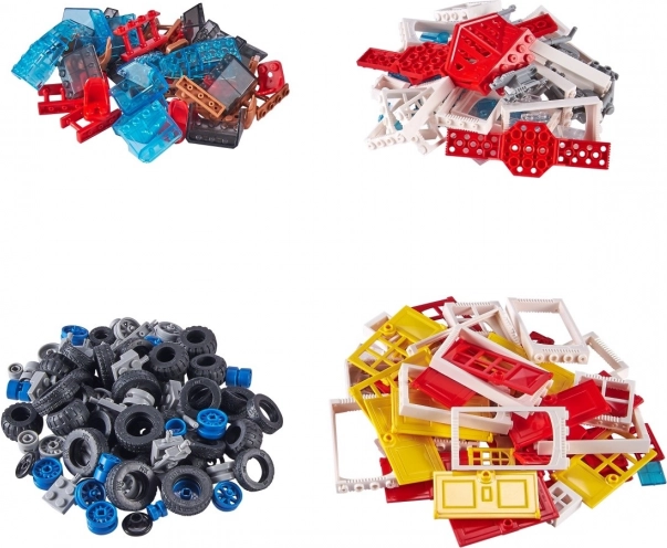 - Contient 250 pièces adaptées à la construction de maisons et de véhicules : portes, fenêtres, éléments de toit, essieux, carrosseries et roues.