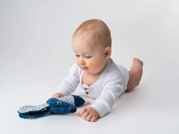 Le sifflet et les oreilles bruissantes stimulent l’ouïe, les matériaux contrastés entraînent la vue et les textures variées développent le toucher. Les étiquettes colorées encouragent la préhension et exercent la motricité fine.