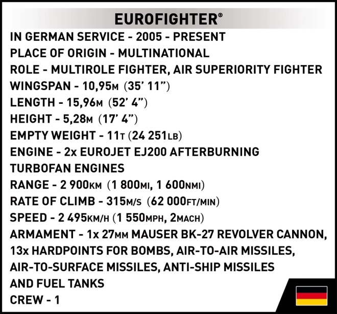 Les formes précises de la cellule, de l’armement et du cockpit offrent un rendu réaliste de l’EUROFIGHTER, idéal pour les collections comme pour l’apprentissage.