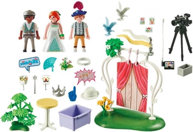 Le coffret contient trois figurines PLAYMOBIL, une toile de fond pour la prise de vue, un appareil photo sur trépied, une table haute, un moniteur et une variété d’accessoires de déguisement pour des photos mémorables.
