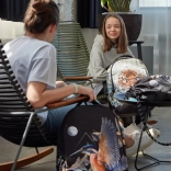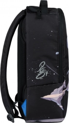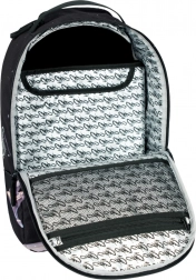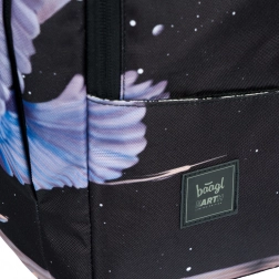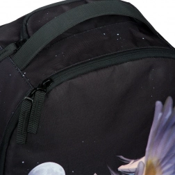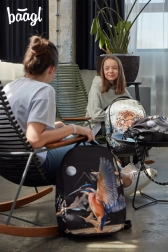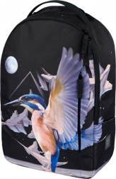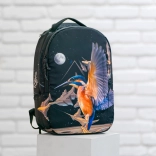 Le design du sac à dos est orné d’un motif de martin-pêcheur en vol, accompagné de formes abstraites et d’une lune. Cette impression marquante fait du sac à dos le centre de l’attention.