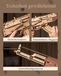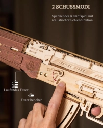 Ce modèle combine à merveille défi technique et belle qualité de fabrication en bois. Il fait une décoration stylée pour un bureau ou une chambre, et amuse lors de concours de précision. Produit destiné aux constructeurs à partir de 14 ans. Ne visez pas les personnes ni les animaux ; les matériaux d’emballage ne sont pas des jouets.