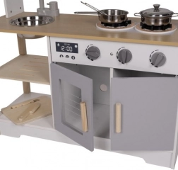 Accessoires pour petits chefs - nous ajoutons au set : une casserole, une poêle et un couvercle, une planche à découper, 2 assiettes, un couteau, une louche, une spatule, du sel, du poivre, de la moutarde, du ketchup. L’évier de la cuisinière est amovible, l’enfant/le parent peut le remplir d’eau après le jeu et laver la vaisselle « sale ».