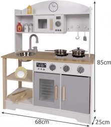 HAUTE QUALITÉ - la cuisine est fabriquée en bois de qualité, ce qui influence fortement sa durabilité ainsi que la sécurité et la santé des plus petits. Il s’agit d’un design intemporel qui plaira à chaque enfant. Grâce à son style classique, elle a toujours été très appréciée. Un travail particulièrement soigné, une finition esthétique et une attention portée aux plus petits détails apportent une valeur ajoutée au produit et flattent l’œil. La cuisine peut également remplir avec succès une fonction décorative et devenir l’ornement de la chambre d’enfant.