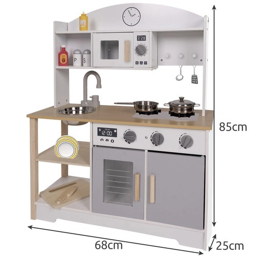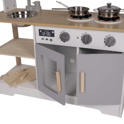 HORLOGE ANALOGIQUE + Sons - l’horloge analogique est placée à hauteur des yeux de l’enfant, les aiguilles sont mobiles, permettant d’apprendre l’heure, les brûleurs de la cuisine et le micro-ondes émettent un clic lors du réglage des cadrans ! Votre enfant sera ravi - la cuisine lui offrira des heures de jeu insouciant.
